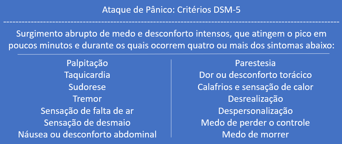 Ao longo do relato, identificamos diversos sintomas decorrentes da ativação autonômica do paciente (taquicardia, sudorese, vasoconstrição periférica), que já sugerem um Ataque de Pânico. O médico plantonista, no entanto, não fez o diagnóstico correto, você faria? Para garantir que a resposta seja “SIM!”, vamos revisar os critérios do DSM-V para diagnóstico do Ataque de Pânico: