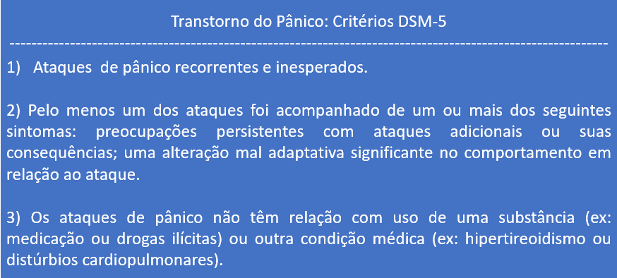A repetição do quadro sintomático nos fazer pensar que não estamos diante de episódios pontuais de ataque de ansiedade, mas sim de um quadro de Transtorno do Pânico, que, de acordo com o DSM-V, apresenta os seguintes critérios: