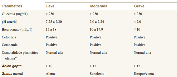 Para entendermos melhor a diretriz diagnóstica, você verá a seguir um quadro da ADA (American Diabetes Association) que estratifica a gravidade da cetoacidose diabética em leve, moderada e grave.
