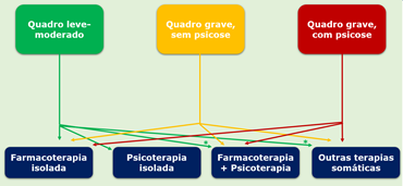 A escolha da abordagem inicial depende de diversos fatores, como a condição clínica do paciente, a presença de outros transtornos mentais simultâneos, a experiência terapêutica e a preferência do paciente. A imagem a seguir resume as indicações de cada opção de tratamento: (*: indicados para casos específicos)