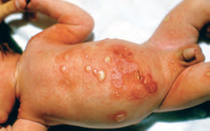Aspecto da lesão: a face é o local mais afetado. A lesão inicia-se com vesículas que se transformam em bolhas flácidas de paredes finas, com conteúdo inicialmente claro que, depois, torna-se turvo. As bolhas se rompem facilmente, permanecendo a erosão rasa rodeada por restos da bolha.