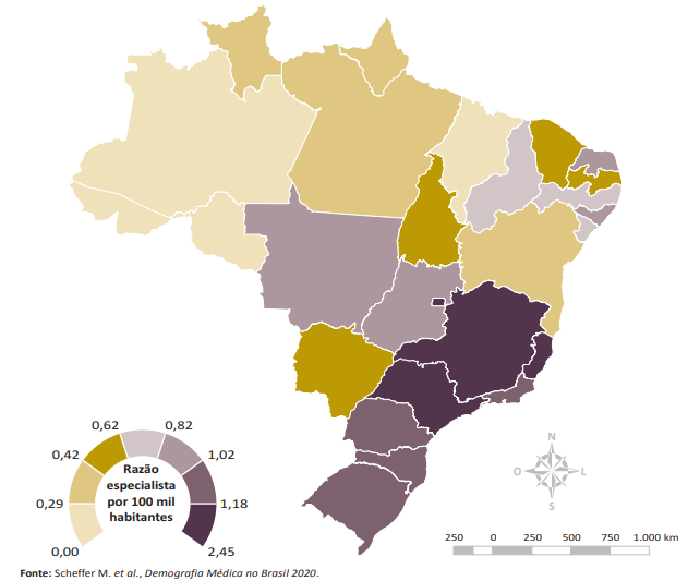 Como podemos perceber, a razão especialista por 100 mil habitantes é muito baixa: 1,02. Valor este muito inferior ao necessário visando que estamos passando por um processo de envelhecimento populacional e a demanda por geriatras é cada vez maior e necessária com a mudança da estrutura da pirâmide etária brasileira.