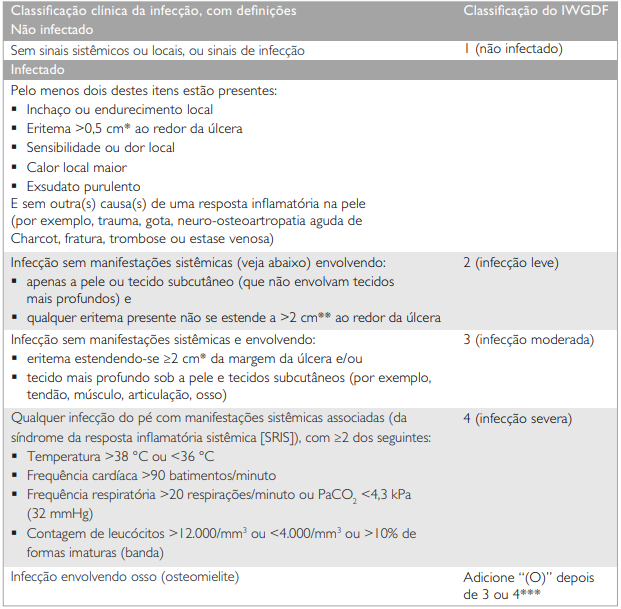 A IWGDF utiliza-se de sinais clínicos e laboratoriais para classificar o paciente, como mostra a tabela abaixo.