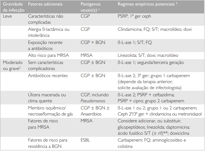 - A seleção empírica do antibiótico para o tratamento da úlcera infectada leva em consideração diversos fatores. A tabela a seguir resume as principais recomendações: