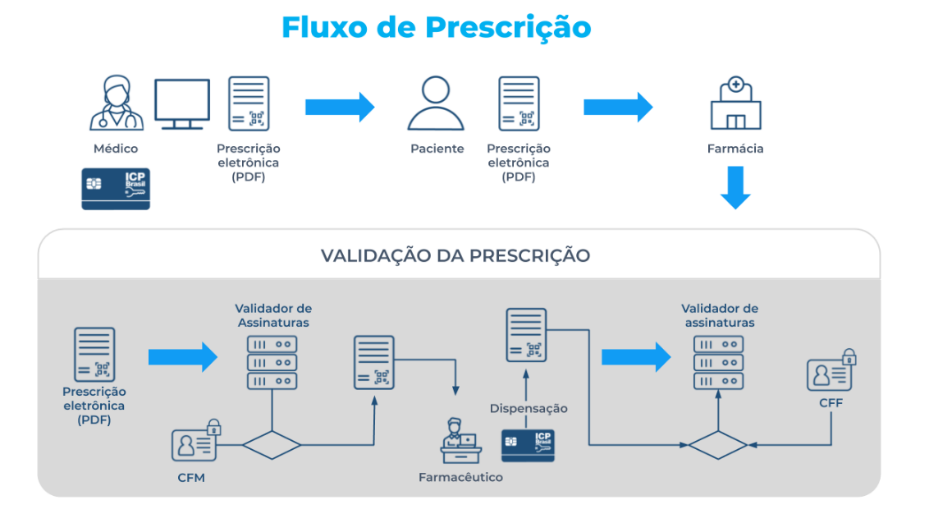 Para realizar a prescrição eletrônica , o médico deve usar assinatura eletrônica, por meio de certificado digital emitido pela Infraestrutura de Chaves Públicas Brasileira (ICP-Brasil). O médico preenche os formulários médicos (receitas, laudos e atestados), assina e envia o documento para o paciente ou responsável (via e-mail, SMS, aplicativo de mensagens).