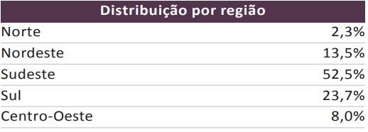 A região sudeste concentra mais de 50% de todos os psquiatras do país, seguida da região sul, que concentra 23,7%. As outras três regiões do país concentram os 23,8%, como mostram a tabela e o mapa a seguir.