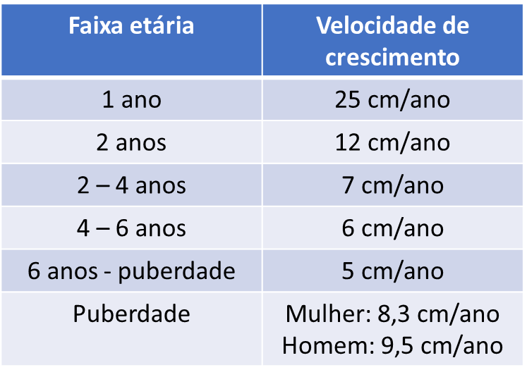 Uma vez constatada a baixa estatura pelos gráficos, é preciso verificar a velocidade de crescimento do paciente. Para isso, faz-se 2 medidas da estatura com intervalo mínimo de 6 meses e compara-se com a velocidade média de crescimento por idade, como mostra a tabela a seguir.