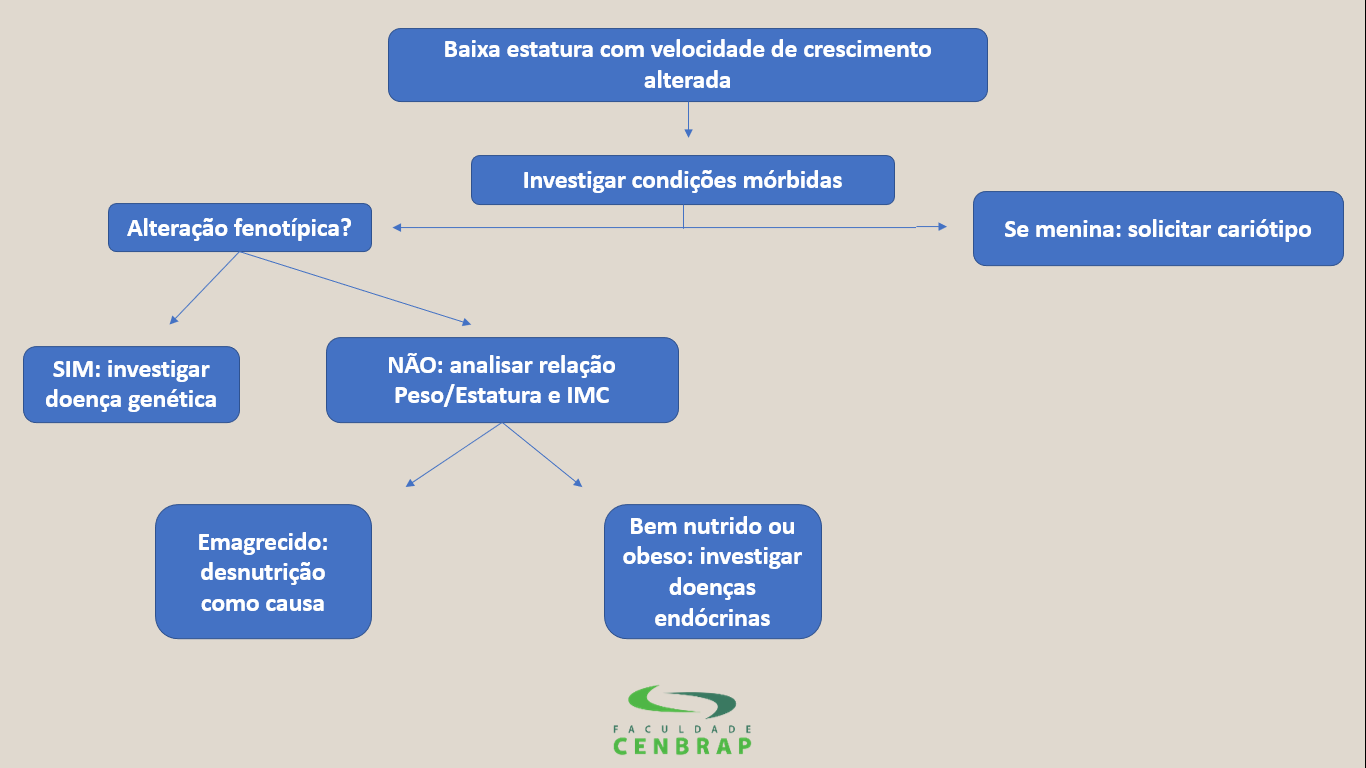 Se o paciente apresenta baixa estatura e redução da velocidade de crescimento, deve ser feita a investigação para condições patológicas subjacentes que justifiquem tal fato. Dentre as principais causam, destacam-se as doenças endócrinas, alterações genéticas e a desnutrição.