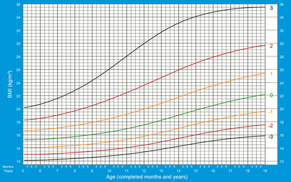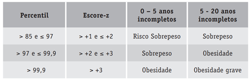 De acordo com as atuais diretrizes da SBP e ABESO, a criança deve ter seu estado nutricional avaliado de acordo com a curva IMC/idade por percentil e escore-Z. A partir de então, é possível diagnosticar o sobrepeso ou obesidade, como mostram a tabela e figura a seguir.